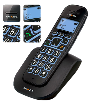 Главное и наиболее наглядное качество, отличающее TX-D8405A от других моделей линейки радиотелефонов DECT – это размер. Корпус трубки выполнен из разных фактур, сочетание матового и глянцевого пластика, а клавиши из прорезиненного материала. Клавиатура оснащена также крупными кнопками 11x12 мм., при нажатии на которые слышен характерный щелчок. Как и полагается «бабушкофону», нанесение символов контрастное и хорошо читаемое. Дисплей и кнопки новинки имеют красивую ярко-голубую подсветку. На левую грань телефона вынесена кнопка, с помощью которой возможно дополнительное усиление громкости сигнала в трубке. Дополнительно в teXet TX-D8405A реализован определитель номера русского стандарта АОН и европейского Caller-ID с памятью на 10 номеров.