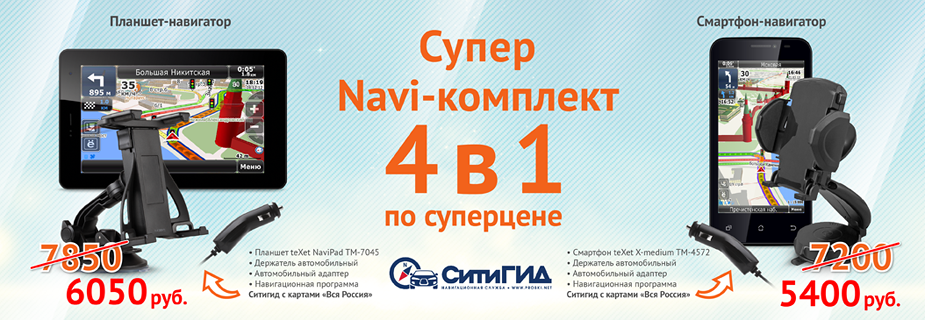 Автомобильные навигаторы капитулируют! teXet предлагает современное и более выгодное решение – Navi-комплекты 4 в 1, включающие в себя бюджетный планшет NaviPad TM-7045 3G или смартфон teXet X-medium/TM-4572, автомобильный держатель, зарядное устройство от прикуривателя и лицензионное навигационное ПО от СитиГИД.
