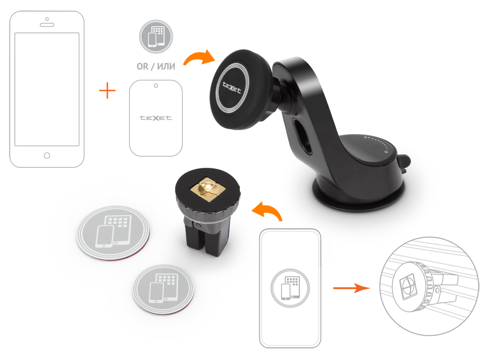 Универсальные магнитные автомобильные держатели от teXet ТСН-1127 и ТСН-1128 легко крепятся и прочно фиксируют телефон в заданном положении. Сам телефон можно поворачивать так, как это удобно именно вам.