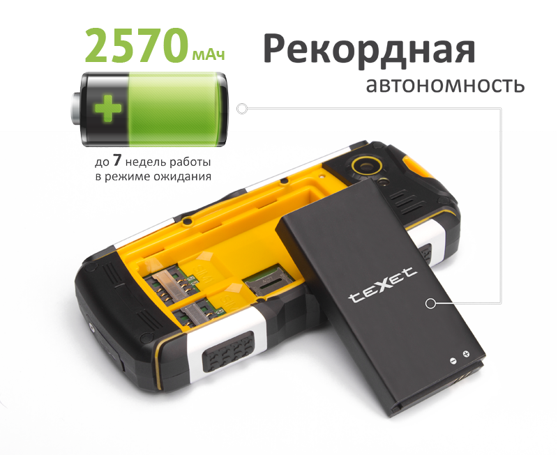 teXet открывает новые горизонты перед искателями приключений и представляет ТМ-512R – лучший защищенный телефон в среднем ценовом диапазоне. Аккумулятор новинки имеет емкость 2570 мАч и обладает поистине атлетической выносливостью – заряда хватает на 7 недель в режиме ожидания! Новая модель включает в себя все лучшие наработки серии защищенных устройств teXet и новшества, подсказанные пользователями. TM-512R получил слоты для двух sim-карт, фотокамеру ударопрочный пыле/водонепроницаемый корпус, усиленный металлическими пластинами.