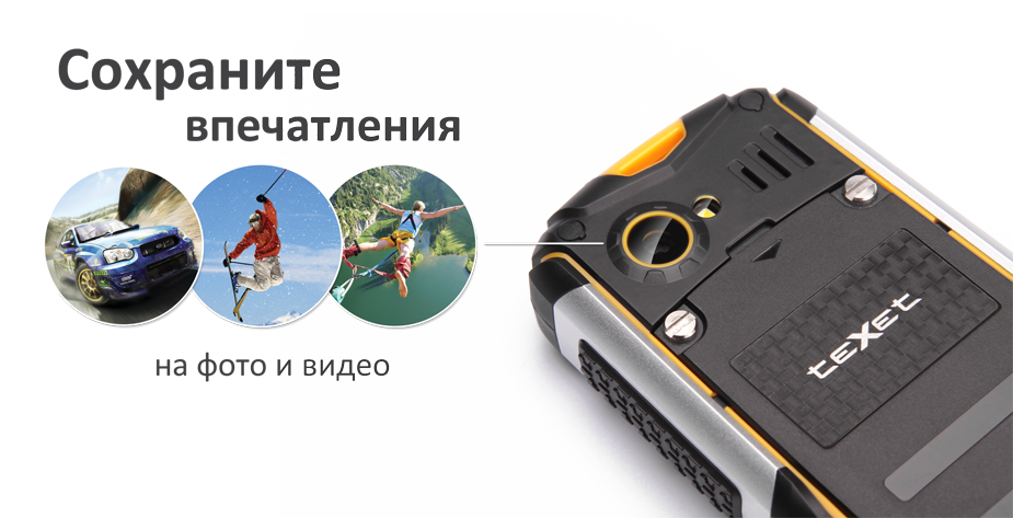 teXet TM-512R безупречно работает там, где другие аппараты выйдут из строя – под водой, в пустыне, на морозе или под палящим солнцем. Уникально сконструированный корпус блокирует путь микрочастицам к системной плате и другим важным компонентам устройства. Пыленепроницаемость, возможность безопасного погружения в воду и пребывания под дождем подтверждены международным сертификатом защиты IP67.