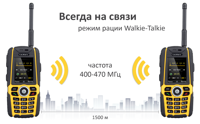 Какими бы не были обстоятельства, пользователи teXet TM-540R всегда будут находиться на связи. Вне города, когда GSM покрытие оказывается слабым или вовсе отсутствует, на помощь приходит режим рации Walkie-Talkie. Название Walkie-Talkie складывается из английских слов walk - идти и talk - разговаривать. Телефон со встроенным радиомодулем превращается в передвижную радиостанцию и действует по европейской безлицензионной системе PMR (Private Mobile Radio, с англ. «частная портативная радиостанция») в УКВ-диапазоне на разрешенных гражданских частотах 400-470 МГц. Сохранять связь с любым совместимым устройством или же с аналогичной моделью возможно на расстоянии до 1,5 километров на открытой местности.