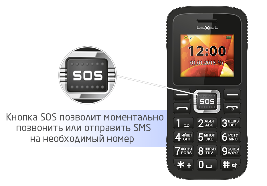 Если пользователь попал в затруднительную ситуацию и не знает, кого вызывать в первую очередь, кнопка «SOS», расположенная на передней панели устройства позволит войти в меню экстренных вызовов и моментально произвести звонок или отправить СМС на запрограммированный номер членов семьи или службы спасения.