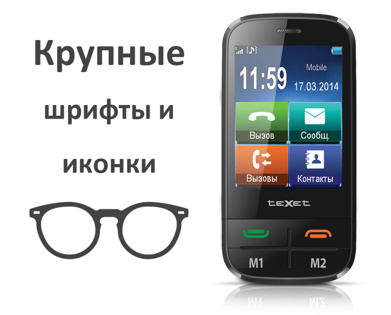 teXet TM-B450 – простой и понятный в обращении телефон. Экраны рабочего стола, каждый пункт меню детально проработаны с учетом особенностей людей с ослабленным зрением. Основной интерфейс телефона состоит из крупных иконок, а в меню устройства используется шрифт увеличенного размера. Все значки и символы легко различимы на ярком емкостном дисплее с диагональю 2,8 дюйма. Простое движение пальцами позволяет перемещаться по разделам устройства, набирать номера, сообщения или же использовать базовые приложения.