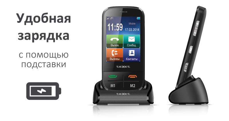 teXet TM-B450 не требует частых подзарядок, емкость батареи рассчитана на 8 часов непрерывных разговоров или больше двух недель работы в режиме ожидания. Восполнить ресурс аккумулятора просто с помощью специальной подставки для зарядки – достаточно зафиксировать телефон на базе и немного подождать. Подобный способ зарядки существенно облегчает использование модели людям с ослабленным зрением, которым непросто вставить штекер в гнездо без очков.