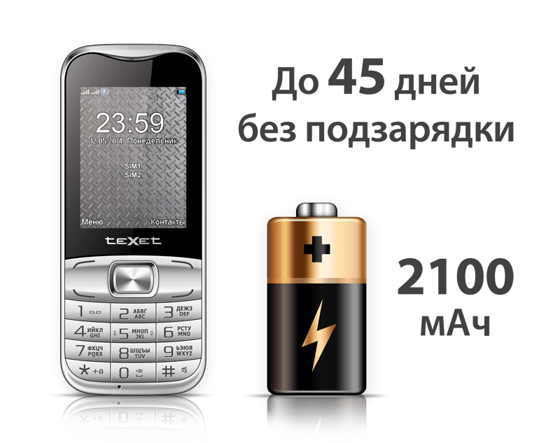 Каждый пользователь современной техники оказывался в ситуации, когда нужно сделать срочный звонок, а ресурс аккумулятора смартфона или телефона исчерпан. Для тех, кто устал от постоянной зависимости от розетки, teXet выводит на рынок модель TM-D45 с удивительно долгим временем автономной работы. Мобильный телефон teXet TM-D45 комплектуется батареей на 2100 мАч, сравнимой по емкости с АКБ смартфонов премиального сегмента, что позволяет устройству продержаться до 45 суток без подзарядки.