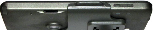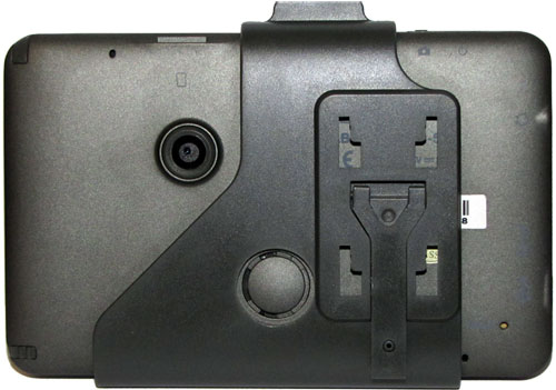 Здесь видим встроенный в корпус объектив камеры и группу отверстий для вывода звука со встроенного динамика (отметим, что звук громкий и чистый, без искажений, в шуме дороги слышен отлично). В самом низу расположено гнездо для хранения небольшого стилуса (здесь возник закономерный вопрос — для чего здесь стилус? — устройство вполне успешно и удобно управляется грубыми мужскими пальцами, мы проверили).
