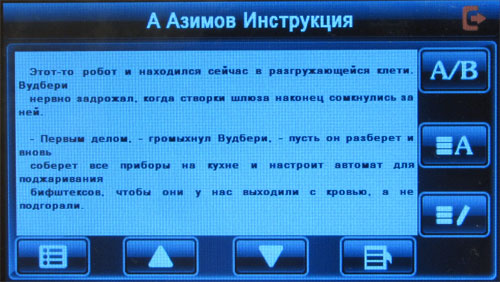 Тем пользователям, кто избалован такими читалками, как AIReader или CoolReader, интерфейс и возможности встроенной читалки покажутся крайне бедными — доступны лишь функции выбора цвета и размера шрифта, постановка закладок и… все. Ну разве что еще можно упомянуть о возможности разворота текста на весь экран. Но не надо забывать, что основная функциональность teXet TN-515DVR — это все же не чтение электронных книг.