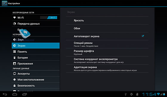 В настройках выставляются время «спящего режима» (15 секунд, 30, 1 минута, 2, 5, 10 и 30) и размер шрифта (мелкий, обычный, крупный, огромный). Последний пункт советую поставить на «крупный». Мне кажется, он лучше всего подходит под диагональ и разрешение экрана. Также в настройках присутствуют пункты: первый - «Система координат акселерометра», содержащий «Систему координат по умолчанию» и «Специальную»; второй - «Адаптация экрана» (используется для корректировки изображения в некоторых играх). За поворот изображения отвечает трехосевой акселерометр (BMA250).