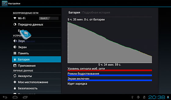 Мне кажется, вполне неплохие показатели для Android-планшета с большим экраном. От USB заряжается очень долго, поэтому лучше всего воспользоваться сетевым адаптером с выходным током 2000 мАч.