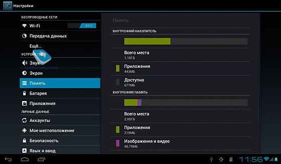 В устройстве присутствует модуль Wi-Fi 802.11 b/g/n, USB 2.0 со скоростью передачи данных до 7 МБ/с + USB-хост «On-the-Go» (в комплекте есть кабель miniUSB на USB). Флешки идут без проблем, кстати, файловая система может быть как FAT32, так и NTFS: «заливаете» файлы любого размера – будь то обычный DVDRip на 1.4 ГБ или HDRip «весом» 10 ГБ. Напомню, что многие планшеты не поддерживают работу с NTFS.
