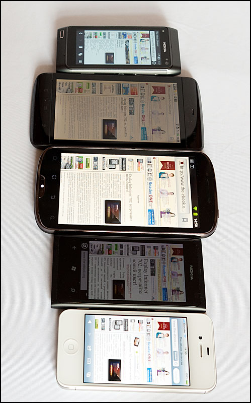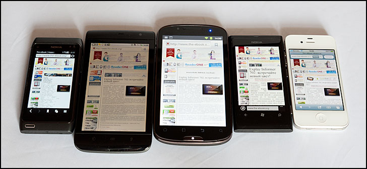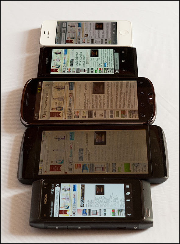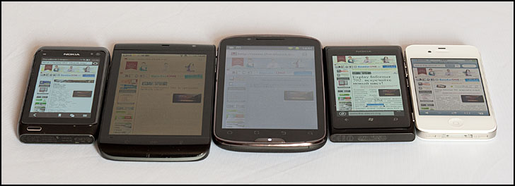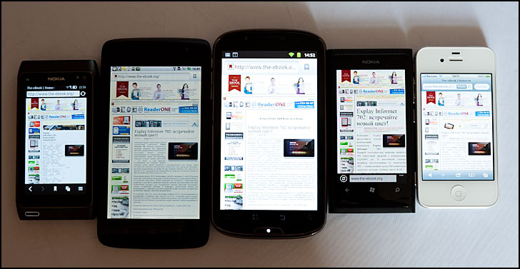 В этот раз лучше показать результат исследования, чем просто его комментировать. Для сравнения использовались модели: (обозначены цифрами слева направо) два аппарата с экраном AMOLED – (1) Nokia N8 и (4) Nokia Lumia 800, аналогичный по размеру экрана смартфон (2) Dell Streak 5 и (5) Apple iPhone 4S. В центре (3) teXet TM-5200.