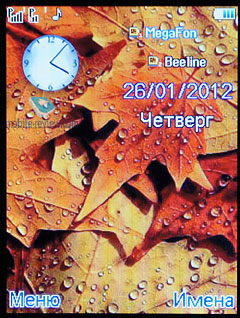 «Главный экран» представлен теми же элементами, что и «Экран блокировки» с добавлением двух пунктов: «Меню» и «Контакты». Кнопкам джойстика присвоен запуск различных приложений: например, «Вверх» - калькулятор, «Вниз» - музыкальный плеер, «Влево» - смс, «Вправо» - календарь.
