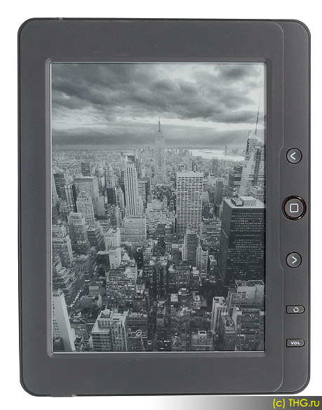 «Чем-то напоминает калькулятор» – такая мысль возникла у нас, когда мы впервые увидели teXet TB-126. Причиной данной ассоциации является не совсем обычная форма корпуса данной книги, напоминающей «счетную машинку»: в сравнении с большинством электронных книжек, teXet TB-126 более «квадратная» – не очень длинная и достаточно широкая. Такая ее форма обусловлена расположением управляющих кнопок: они находятся не снизу, как это часто бывает, а справа от экрана. Их пять: кнопка подтверждения/выбора (напоминающая основную кнопку iPhone), две навигационных «стрелочки», кнопка возврата к предыдущему уровню меню и кнопка вызова регулировки громкости – звучит странно; на самом деле это кнопка, при нажатии на которую навигационными «стрелочками» можно регулировать громкость. Работает она только во время воспроизведения музыки или прослушивания радио.