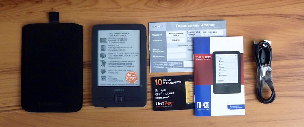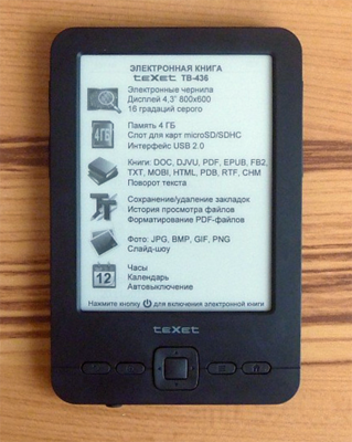 Электронный ридер teXet TB-436 оснащен дисплеем диагональю 4,3 дюйма, выполненным по технологии E-Ink и передающим 16 градаций серого, разрешением 800х600 пикселей. Внутренняя память устройства – 4 Гб, поддерживаются карты памяти microSD объемом до 16 Гб.