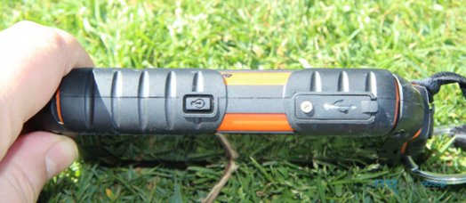 Нижняя боковая грань имеет резиновое утолщение. При желании именно нижней частью будет комфортно колоть орехи или отбиваться от хулиганов. На правую грань выведена кнопка «камера» и качели громкости. С левой стороны размещен microUSB-порт и кнопка активации вспышки. Все динамики защищены хромированной сеткой. Несмотря на защиту, звук у teXet TM-3200R громкий и отчетливый, его слышно даже под водой.