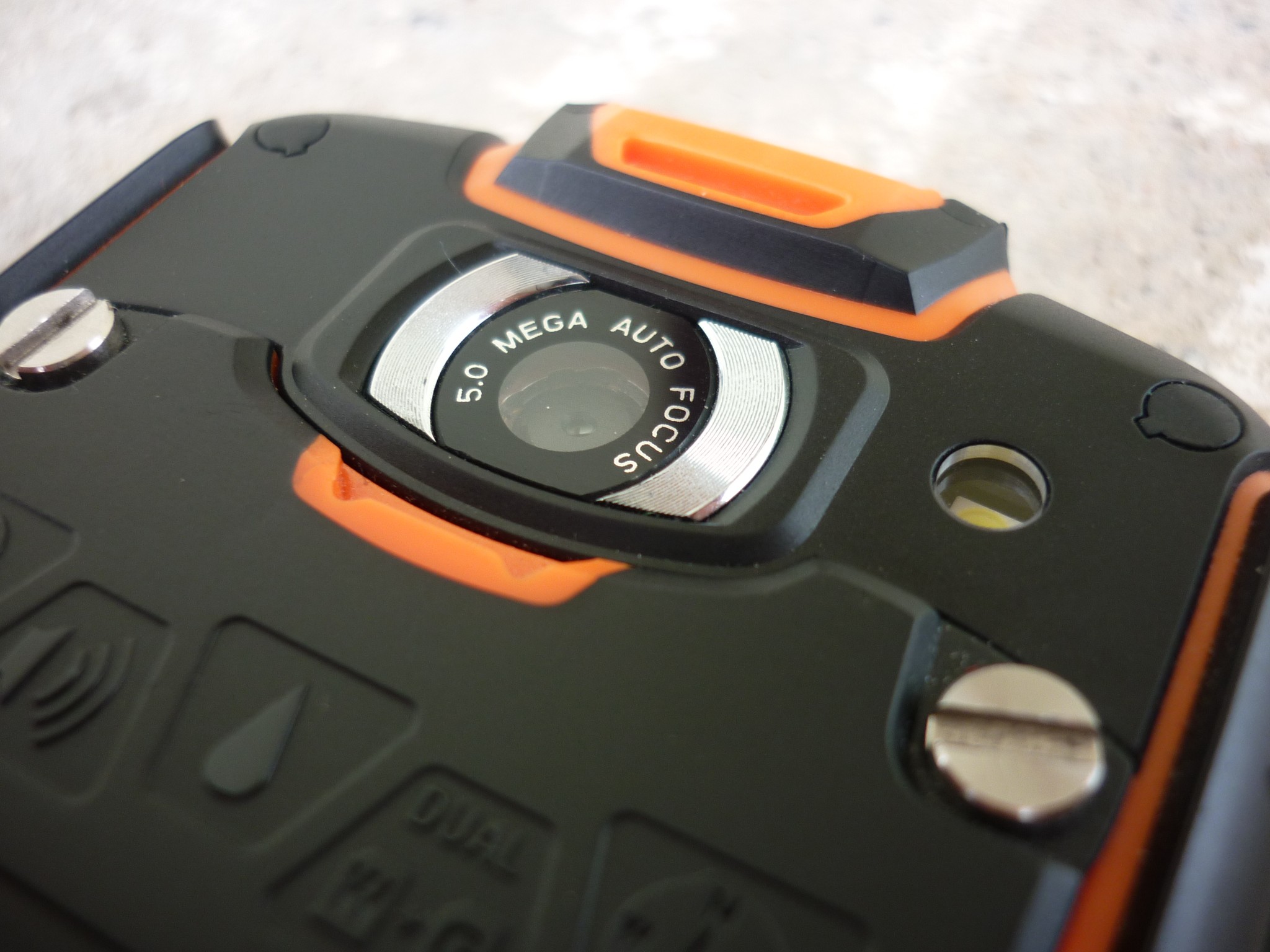 На правой грани расположены качель регулировки громкости и кнопка камеры, на левой – заглушка micro-USB и кнопка фонарика, сверху – заглушка 3,5 мм jack и кнопка включения/разблокировки. Стоит заметить, что кнопки на боковых гранях прорезинены и нажимаются очень туго, что, по факту, исключает ложные нажатия. На задней стороне имеются значки, описывающие некоторые особо значимые функции аппарата, вроде фонарика, громкого динамика, водостойкости, поддержки двух сим-карт (2G и 3G) и наличия компаса. Крышка держится на стальных винтах и имеет алюминиевую подкладку. В нижней части крышки красуется логотип teXet, а сразу под ней расположился динамик. Над камерой – место для крепления ремешка, идущего в комплекте поставки.
