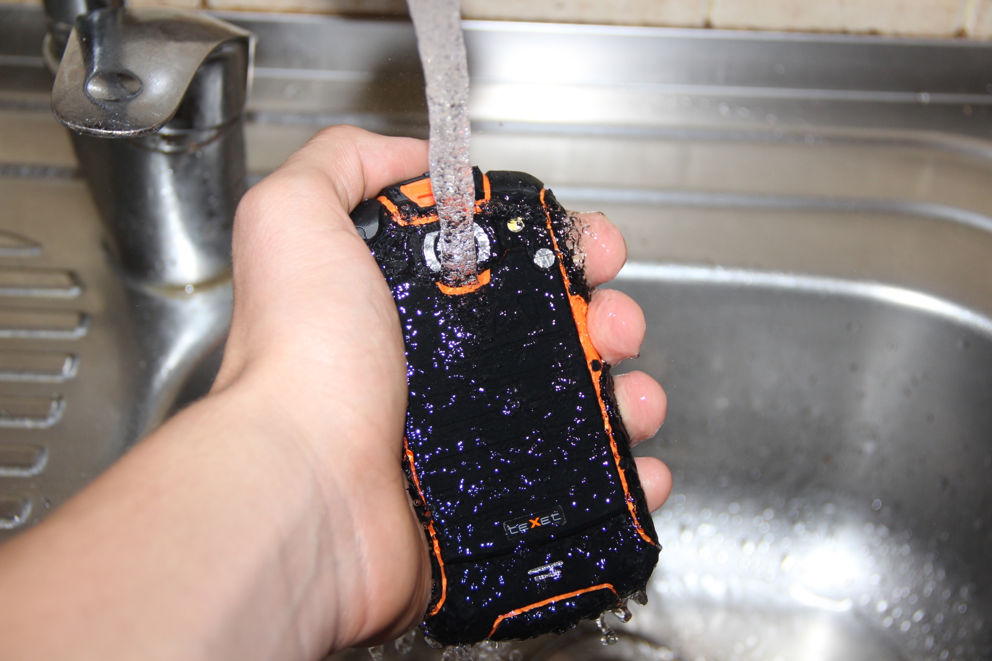 teXet TM-3204R обладает стандартом пыле-влаго устойчивости IP67, что позволяет ему пережить кратковременные погружения в воду и защищает внутренности от попадания пыли. Учтите, что слабым местом защиты является отверстие микрофона, размещённое под кнопкой приёма вызова, через которое вода все же может просочиться, после чего телефон необходимо просушить.