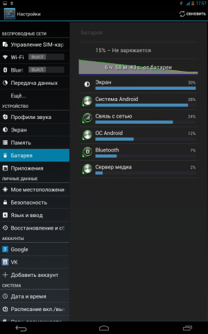 teXet TM-7055HD 3G оборудован аккумулятором емкостью 4000 мАч. Если использовать планшет как плеер и читалку, заряда аккумулятора хватит на 3-4 дня. Если нагрузить его HD видео или 3D играми, то планшет вполне продержится 5-6 часов.