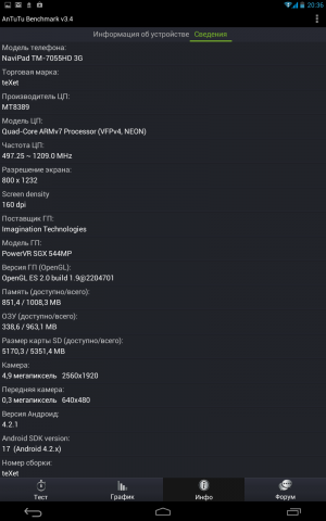 NaviPad TM-7055HD это первый планшет от бренда teXet, оборудованный четырехъядерным процессором MTK 8389 с видеоускорителем PowerVR SGX544. Решение оправданное – процессор производительный и неэнергоёмкий, благодаря техпроцессу 28 нм. Металлическая крышка планшета не нагревается даже на самых «тяжёлых» по графике играх, сами же игры, при этом, работают прекрасно. На последних трёхмерных творениях игроиндустрии Android, teXet показал себя прекрасно – Need for speed Most Wanted, Real Racing 3, Dead Trigger, Dungeon Hunter 4 успешно запускаются и при игре никаких проблем не возникает. С видео-форматами HD и FullHD справился прекрасно даже встроенный проигрыватель, никаких других видеоплееров устанавливать не потребовалось.
