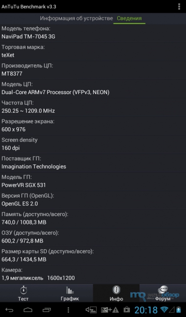 В Antutu Tester планшет teXet TM-7045 3G набирает 526 баллов. Положительную роль сыграл размер экрана и используемая платформа.