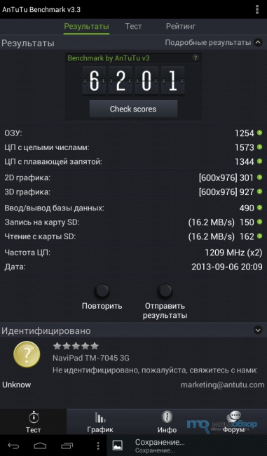 По сложившейся традиции мы начинаем оценку производительности с синтетических тестов. В Antutu Benchmark планшет teXet TM-7045 3G набирает 6201 балл.