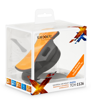 Самая яркая и самая компактная новинка – держатель AnyGrip TCH-1126. В конструкции модели нет ничего лишнего: за счет PU-стикера AnyGrip не требуется никаких дополнительных фиксаторов, бортиков или упоров. Любое устройство весом до 300 гр будет буквально висеть в воздухе. При этом надежность держателя несомненна – резкий поворот, торможение или ухабы на дороге не сбросят технику с пьедестала.