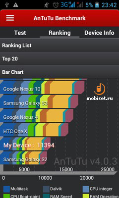 В тесте AnTuTu гаджет набрал 11394 «попугаев». Больше, чем Samsung Galaxy S2, но меньше, чем HTC One X. Производительность в играх неплохая. Возможностей гаджета хватает для комфортной игры в проекты уровня Breach & Clear.