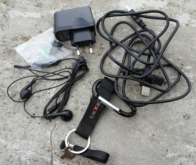В комплекте с teXet X-driver идут два кабеля microUSB-USB (в принципе, и одного за глаза хватает, но чем больше, тем лучше), блок зарядного устройства, простая стереогарнитура, карабин с аналоговым компасом и отверткой для откручивания болтиков, а также две сменные заглушки для разъемов 3,5 мм и microUSB.