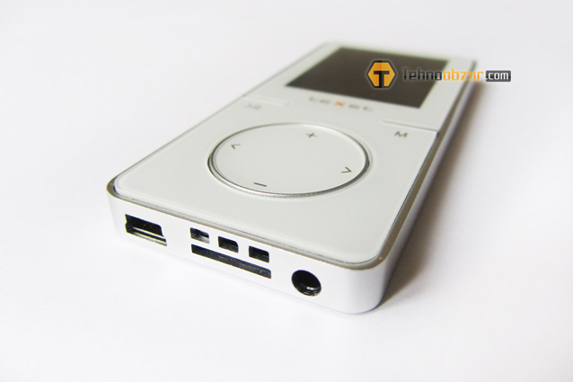 Справа сверху кнопка «М» для выхода в главное меню и подтверждения выбора. В кругу расположены еще четыре кнопки, которые можно использовать для навигации и перемотки музыки, а также «+» и «–» служат для регулировки уровня громкости. На левом торце расположена кнопка-тумблер для переключения включения/выключения питания.