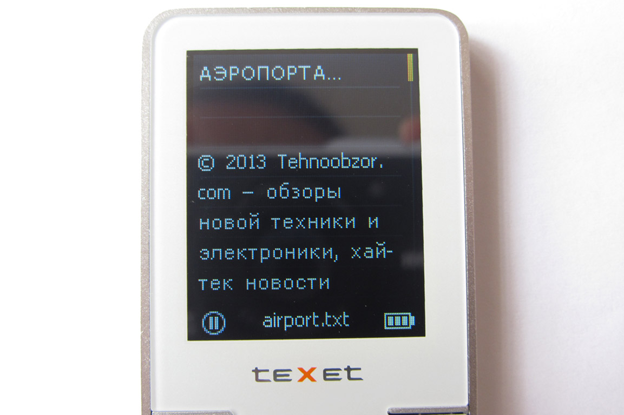 MP3-плеер поддерживает распространенный формат текста txt. В настройках устройства имеется функция автоматического просмотра текстовых файлов, что позволяет листать странички в автоматическом режиме, достаточно установить интервал от 2 до 10 секунд, через который плеер сам будет перебрасывать на следующую страницу. Также есть функция создания закладок. Простая и всем известная игра тетрис позволит занять себя чем-то увлекательным.
