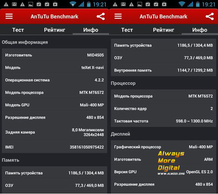 Железо для бюджетника, между прочим, неплохое. Процессор MTK6572, двухъядерный, 1.2 ГГц (в АнТуТу 500 – 1300 МГц). Графика обычная – Mali 400MP. Внутренний накопитель – 4 ГБ. Не много, но купить нужного объема Micro-SD карту сейчас вообще не проблема, даже в финансовом плане.