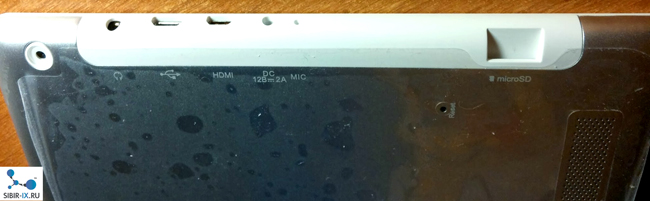 На левом торце корпуса вынесены почти все присутствующие разъемы – аудиовыход для наушников, интерфейсы miroUSB и microHDMI, гнездо для зарядного устройства. Там же расположились микрофон и слот для карт microSD.