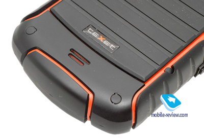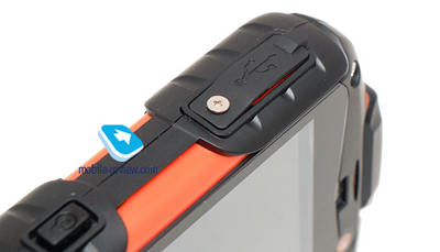 Под «Приемом» расположен микрофон. Качество передачи речи среднее, сказывается защита от пыли и влаги. Кнопка активации подсветки фонариком – слева. Она тугая и не имеет фиксации: нажал – светится, отпустил – перестала светиться. Чуть выше – micro-USB под резиновой заглушкой. Стоит предупредить, что в него вставляется не совсем обычный micro-USB, а с удлиненным коннектором. Возможно, мне не повезло, но в доме не оказалось подобных кабелей. Вероятно, поэтому в комплекте лежат два «юэсбишника».