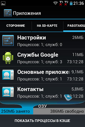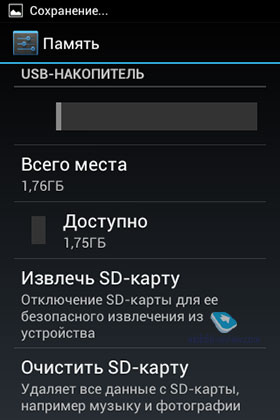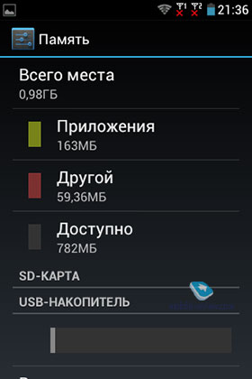 В данной модели установлено 768 МБ оперативной памяти. Из этого объема ОЗУ свободно в среднем около 400 МБ. Встроенной памяти 4 ГБ, доступно для инсталляций приложений около 1 ГБ, для хранения данных чуть менее 2 ГБ. Предусмотрен слот под карту памяти microSDHC до 32 ГБ.