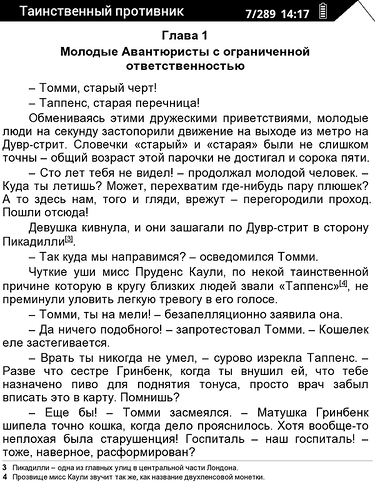 Самое интересное, когда с читалками возишься. Экраны-то у них у всех более-менее одинаковые, железо – тоже, плюс-минус. А вот с софтом каждый сам химичит как может. Порадовался за количество форматов. Что FB2, что ePub выглядят хорошо. Сноски работают, оглавления есть.
