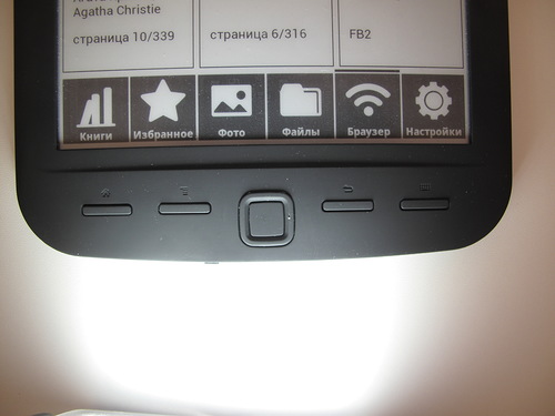 Под экраном – куча механических кнопок. Пятипозиционный джойстик (четыре направления плюс нажатие на него) и четыре «типа андроидные» кнопки. Точнее, три «андроидные» –  «Домой», «Меню», «Назад». И плюс дополнительная кнопка для вызова экранной клавиатуры. Нормальные кнопки, вполне комфортные. По бокам (и слева, и справа) – клавиши для листания. Хорошие, комфортные. Как я люблю.