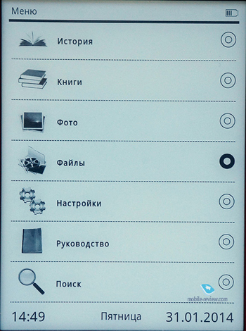 Устройство поддерживает большое количество наиболее распространенных форматов книг, таких как DjVu, PDF, ePUB, FB2, TXT, MOBI, HTM, HTML, RTF, PDB, CHM, DJV. После прошивания и перехода с версии 1.0 на 1.1 появился формат DOC и даже современный DOCX, но пока в тестовом режиме возможны глюки (например, у меня при увеличении размера шрифта закрывалась книга).
