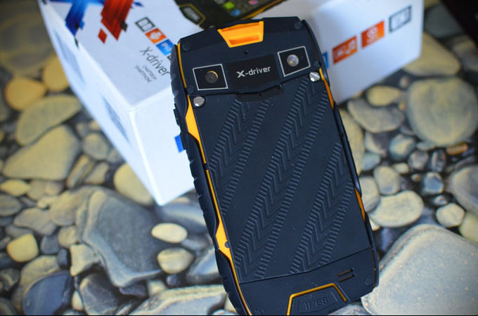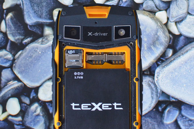 С тыла teXet X-driver недвусмысленно напоминает голову какого-нибудь трансформера – два выразительных глазка (камера и вспышка-фонарик), ротовая полость («IP68»). Того и жди, что смартфон превратится в строительную автотехнику. На крышке присутствует затейливый рельефный узор, будто по поверхности проехались три колеса. Декоративное украшение добавляет харизмы и без того неординарной внешности смартфона.
