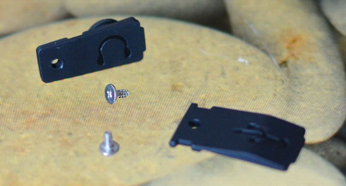 Аудиовыход 3,5 мм и разъем microUSB расположены на более-менее привычных местах, сверху и снизу соответственно. Зато такие монструозные заглушки мне еще не встречались. Мало того, что они крайне плотно установлены и с трудом открываются (поддеть ногтем, как заглушки у других аппаратов, не получится) так еще и уверенно держатся на винтиках.