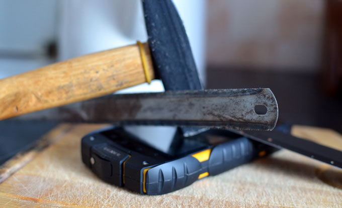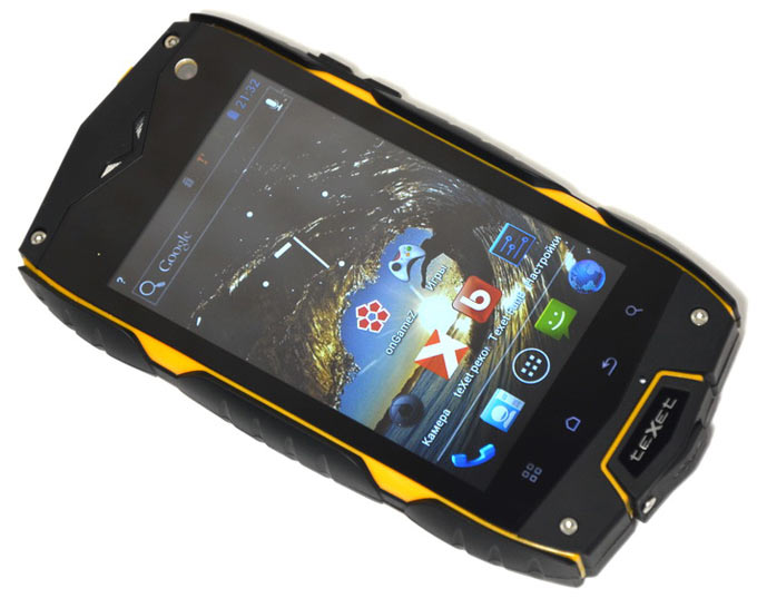 Корпус teXet X-driver своим агрессивно-защищенным внешним видом прямо-таки провоцирует на то, чтобы сбросить смартфон с высоты и иными способами проверить прочность модели. С лицевой стороны царапинам и трещинам противостоит специальное стекло японской компании Asahi Glass, мирового лидера отрасли и первого на своей родине производителя листового стекла. Как утверждает бренд, панель teXet X-driver втрое толще стекла в обычных смартфонах. Не знаю, так ли это, но энергичные удары молотком, обработку острым ножом и даже ножовкой ни к чему не привели.