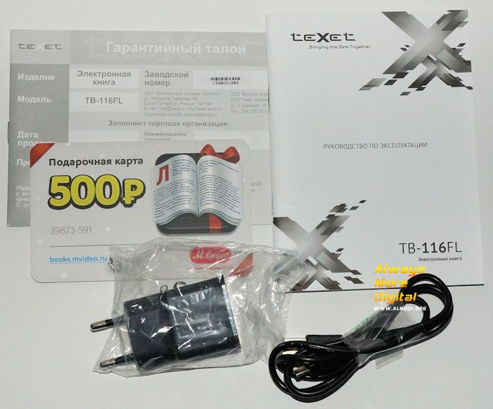Сайт этот представляет собой некий гибрид М.Видео и ЛитРес, которые указаны в списке партнеров, в качестве логотипа используется надпись «M.Books». Наличие такого презента особенно приятно, учитывая относительно низкую цену устройства. Ну и наконец, гарантийный талон и инструкция, они тоже лежат в коробке.