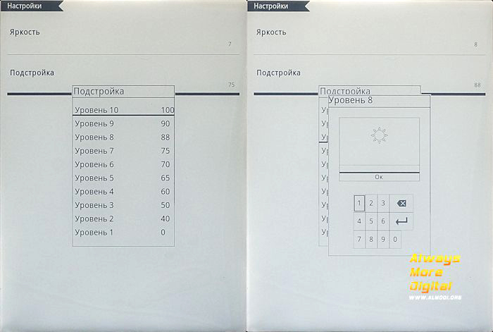 О подсветке. Она реализована здесь при помощи полоски светодиодов, расположенных у границы экрана, соответственно, свет падает на экран и отражается в глаза, в то время как у обычных LED-экранов свет подается прямо под экран, то есть глаз принимает прямые лучи. Отражаемый от светлых участков свет обеспечивает наиболее приближенную к естественному освещению обстановку, поэтому снижается нагрузка на глаза. Каждому уровню подсветки можно задать соответствующее значение освещенности в процентах, поэтому можно настроить уровни, как вам угодно, в соответствии с предпочтениями при разных уровнях освещенности. В сумерках будет хорошее освещение, а в темноте экран не будет бить по глазам.