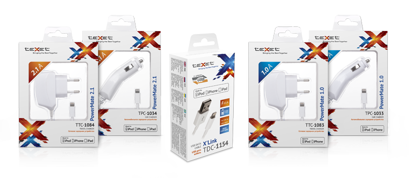 teXet объявляет о начале продаж самых бюджетных зарядных устройств и модели дата-кабеля, лицензированные для Apple iPod, iPhone и iPad, – это серии PowerMate (TPC-1033, TPC-1034, TTC-1083, TTC-1084) и X’Link (TDC-1154). При безупречном качестве, стильном дизайне и уникальных схемотехнических решениях стоимость новинок является одной из самых доступных на рынке!