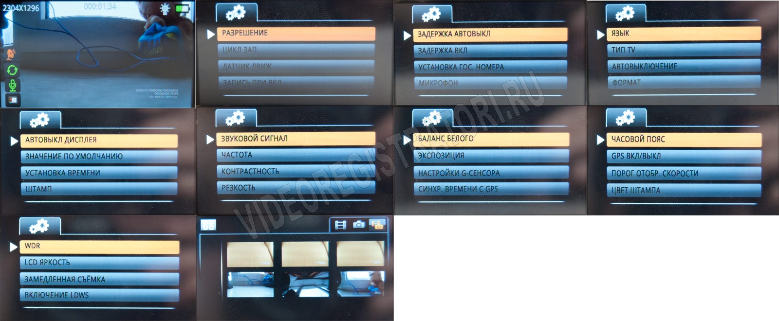 Меню, как у всех топовых моделей teXet, вполне достойное. Есть задержки включения, выключений, на случай если надо избежать произвольных остановок записи при запуске двигателя. Можно убирать/добавлять на видео: скорость, координаты, дату и время, гос. номер. Менять цвет штампов: желтый или белый. Настраивать характеристики видео, длительность циклической записи, чувствительность датчика удара (G-сенсор), а вот датчик движения можно только включить или выключить.