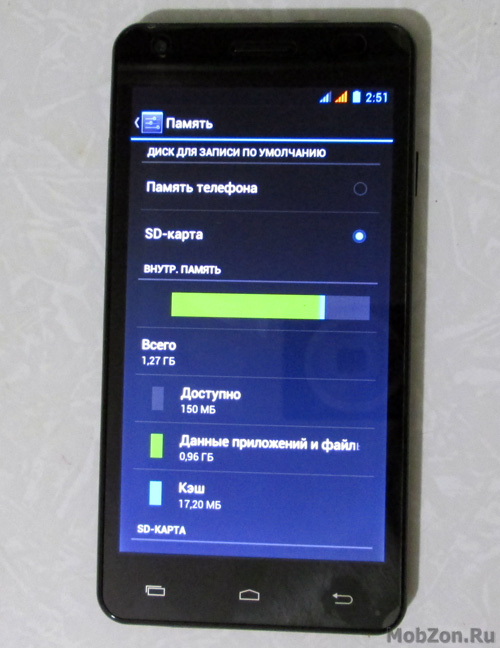 Встроенной памяти 4 ГБ, доступно для хранения данных 1,32 ГБ, и для установки приложений 1,27 МБ. Предусмотрен слот под карту памяти microSDHC до 32 ГБ.