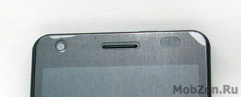 На лицевой панели сверху слева расположена фронтальная камера, по центру разговорный динамик, прикрытый мелкой металлической сеточкой, а справа датчики – освещения и приближения.
