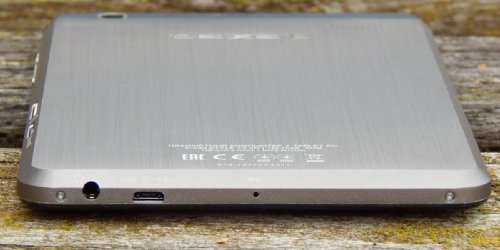 Также в верхней части задней панели присутствует узкая полоска из пластика. С технологической точки зрения назначение пластиковых элементов задней панели планшетного компьютера вполне понятно – там размещены антенны мобильной связи, Wi-Fi и GPS. Но, если в ряде устройств, пластик, дополняющий металлическую заднюю панель, кажется чужеродным, то в teXet X-pad STYLE 7.1 3G пластиковая вставка смотрится вполне гармонично.  Глазок тыловой камеры находится в левом верхнем углу.