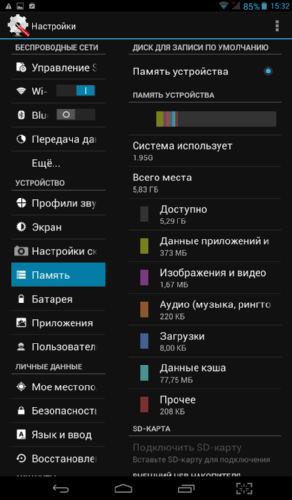 Размер встроенной памяти – 8 ГБ, из которых система занимает 1,95 ГБ.  Остальная память доступна пользователю, причем единым разделом объемом 5,29 ГБ. Ну, наконец-то, производители поняли, что 0,98 ГБ под установку приложений и игр для планшетных компьютеров это излишне скромно.