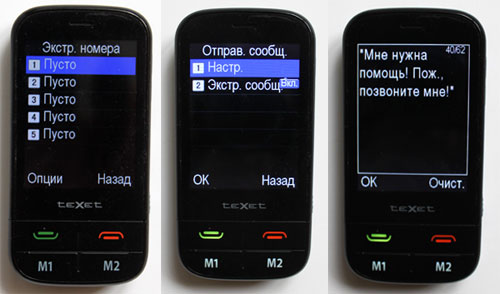 teXet TM-B450 хорошо реализованы SOS-функции, имеющиеся в обычных кнопочных «бабушкофонах» и могущие быть полезными не только людям пожилого возраста, но и детям.